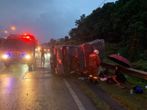 SERIAN: Dua mangsa cedera selepas lori membawa muatan barang runcit terbabit dalam kemalangan di Batu 26, Jalan...
