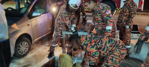 TERSEPIT… Anggota bomba mengeluarkan kaki mangsa yang tersepit di celah besi penutup longkang di Jalan Sirih, malam...