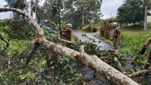 SARIKEI: Sebatang pokok rambutan setinggi kira-kira 20 kaki tumbang dan menghalang laluan di Jalan Kuong Kok, semalam....
