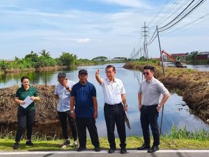 TINJAU… Dato Sri Lee Kim Shin semasa meninjau projek pembersihan saliran, longkang dan kolam tadahan air di...