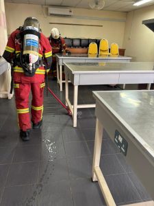 TUMPAH… Anggota bomba berusaha membersihkan tumpahan bahan berbahaya mercury daripada sebuah termometer di Kolej Komuniti Permyjaya di...