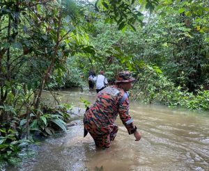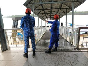 PANTAU DI LOKASI… Anggota APM Sarikei memantau keadaan di lokasi berisiko banjir, hari ini. Foto APM Sarikei...