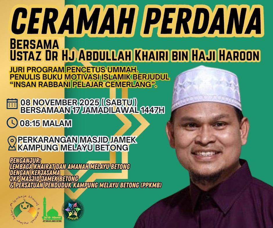 BETONG: Orang ramai dijemput hadir beramai-ramai ke Program Ceramah Perdana bersama Ustaz Dr Abdullah Khairi Haroon yang akan diadakan pada 8 November ini bertempat di Pekarangan Masjid Jamek Betong.