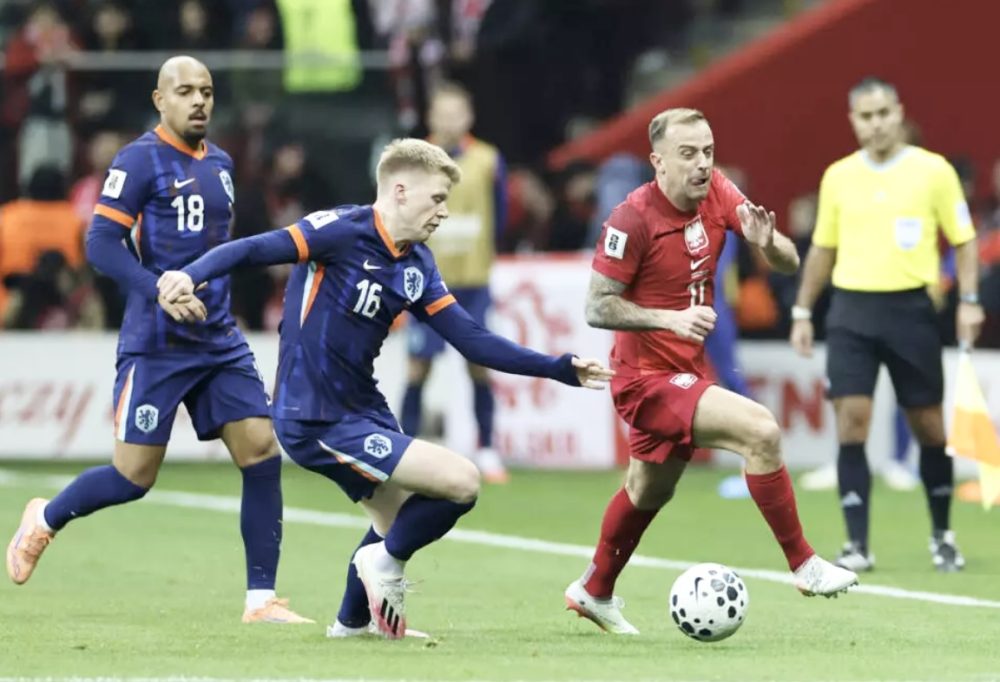 Jakub Kaminski memberi harapan kepada Poland untuk memintas Belanda di puncak Kumpulan G dua minit sebelum rehat, apabila menyambut bola hantaran Robert Lewandowski untuk menewaskan Bart Verbruggen.