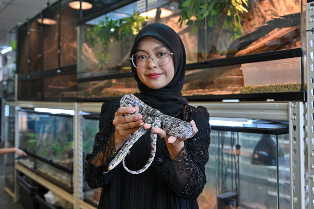 PENGASAS Brotherhood Reptiles, Nur Nina Farisha Woo Abdullah, 29, menunjukkan ular ketika ditemui Bernama baru-baru ini. Tidak semua orang selesa berhadapan dengan haiwan eksotik, apatah lagi memegangnya sambil bercakap di hadapan kamera, satu situasi yang bagi kebanyakan orang sudah cukup untuk menimbulkan rasa takut dan tidak selesa. Foto Bernama