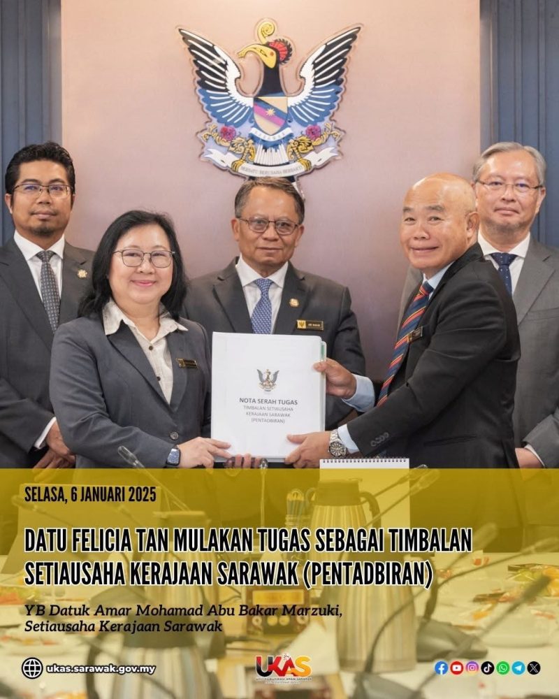 PETRA JAYA: Setiausaha Tetap Kementerian Pembangunan Wanita, Kanak-Kanak dan Kesejahteraan Komuniti, Datu Felicia Tan Ya Hua, memulakan tugas baharunya sebagai Timbalan Setiausaha Kerajaan Sarawak (Pentadbiran) menerusi satu majlis serah tugas yang berlangsung di Wisma Bapa Malaysia, di sini, hari ini.