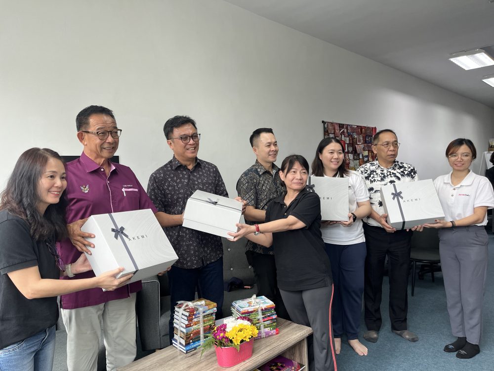 DATO Sri Abdul Karim Rahman Hamzah (dua kiri) menerima sumbangan buku daripada wakil Dayak Daily sempena Program D’Drift edisi ketujuh di Pejabat Dayak Daily, Kuching. Turut kelihatan para penganjur dan tetamu yang hadir.