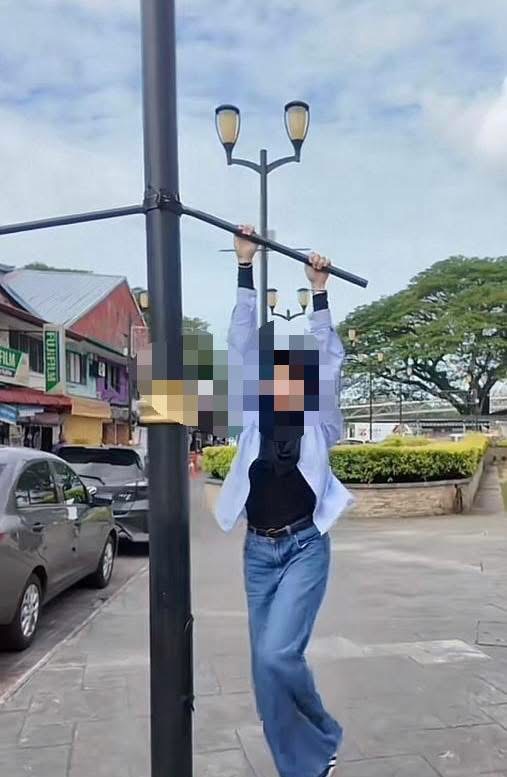 TIGA individu yang tular di aplikasi TikTok kerana memanjat struktur papan tanda jalan dan tiang lampu di sekitar bandar raya Kuching. Foto DBKU