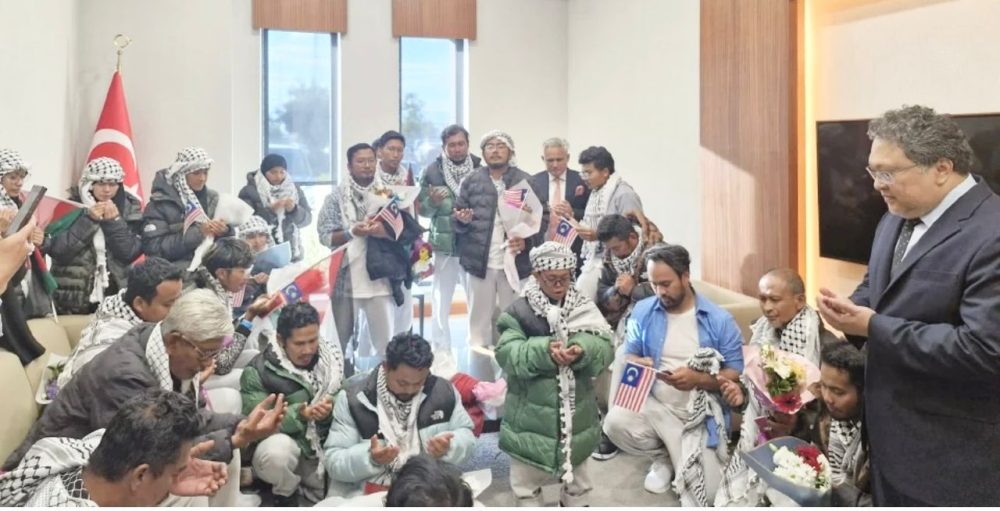 DUTA Besar Malaysia ke Republik Turkiye, Sazali Mustafa Kamal (kanan) menyambut sukarelawan kemanusiaan Global Sumud Flotilla (GSF) Malaysia di Lapangan Terbang Istanbul, Turkiye. – Foto Kedutaan Besar Malaysia Ankara @MYEmbAnkara.