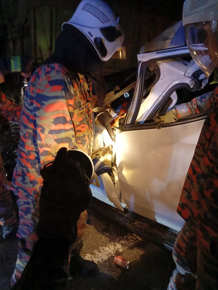 PASUKAN BOMBA….Menjalankan operasi mengeluarkan mangsa yang tersepit dalam kemalangan berhampiran Bulatan Dudong Jalan Sibu-Durin, malam tadi. Foto JBPM Zon Sibu