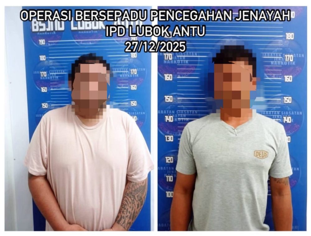 LUBOK ANTU: Dua lelaki tempatan ditahan pasukan polis dalam Operasi Tapis Khas/Operasi Bersepadu Pencegahan Jenayah yang dijalankan oleh Ibu Pejabat Polis Daerah (IPD) Lubok Antu di sekitar kawasan Engkilili dan Lubok Antu, petang semalam.