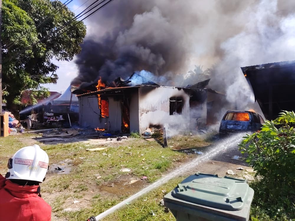 KUCHING: Dua rumah setingkat jenis kekal musnah dalam satu kejadian kebakaran di Buntal Seafood Centre, Jalan Kampung Buntal, di sini, petang ini.