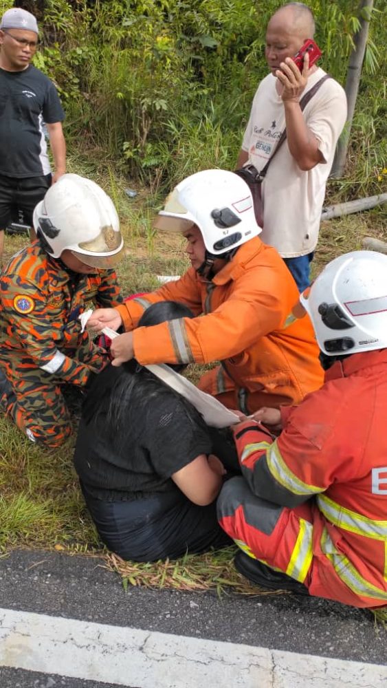 Anggota bomba bertindak memberikan rawatan awal kepada mangsa wanita di lokasi kejadian sebelum menyerahkannya kepada pihak Angkatan Pertahanan Awam Malaysia (APM) untuk dibawa ke hospital bagi rawatan susulan.