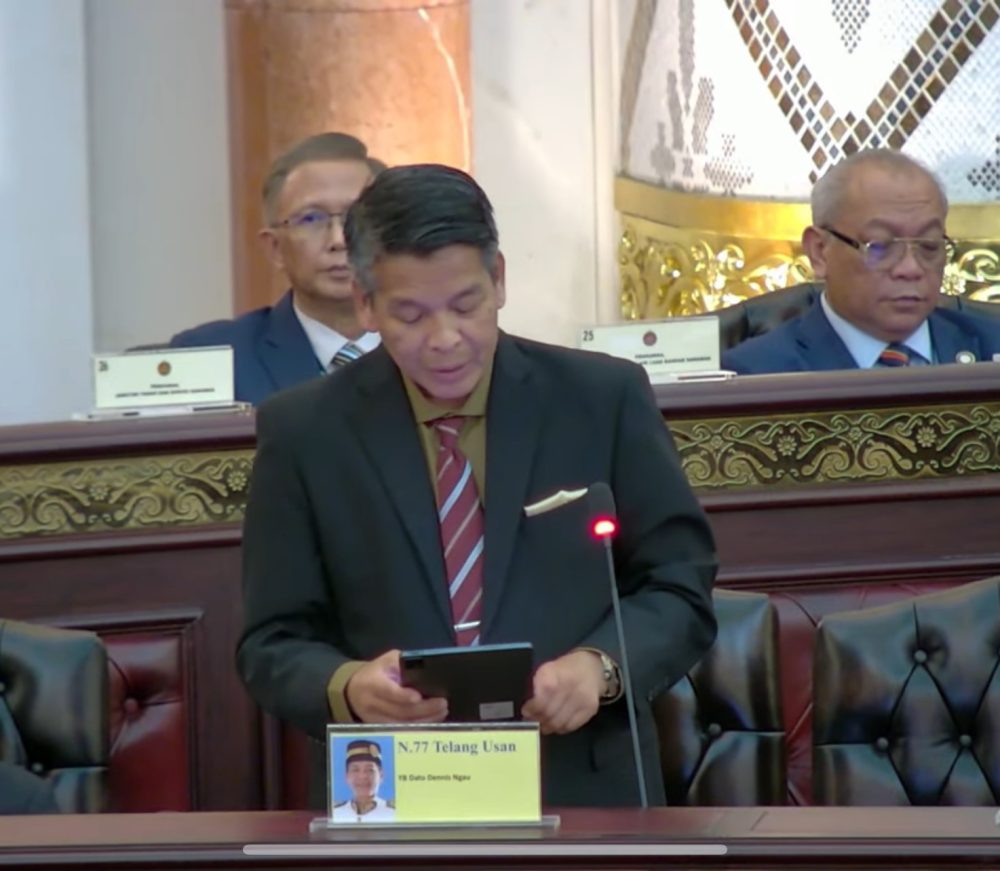 DENNIS Ngau (Telang Usan-GPS) ketika berucap pada sesi perbahasan pindaan Rang Undang-Undang Perlembagaan Negeri Sarawak 2025, hari ini. Foto UKAS