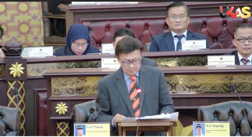 JELASKAN... Tan Sri William Mawan semasa perbahasan Belanjawan 2026 pada sidang DUN, hari ini. Foto UKAS