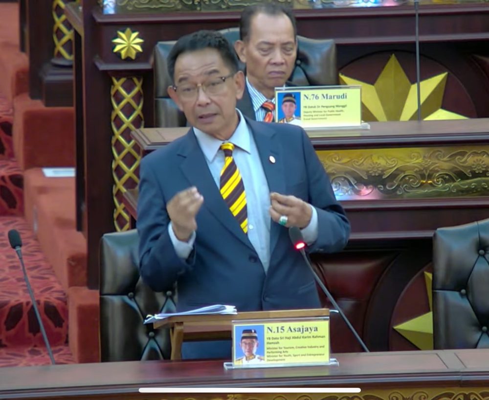 DATO Sri Abdul Karim Rahman Hamzah (Asajaya-GPS) ketika penggulungan pembahasan Rang Undang-Undang (RUU) Perlembagaan Negeri Sarawak (Pindaan) 2025 pada Mesyuarat Ketiga Penggal Keempat DUN Sarawak Ke-19, di Petra Jaya, hari ini. Foto UKAS