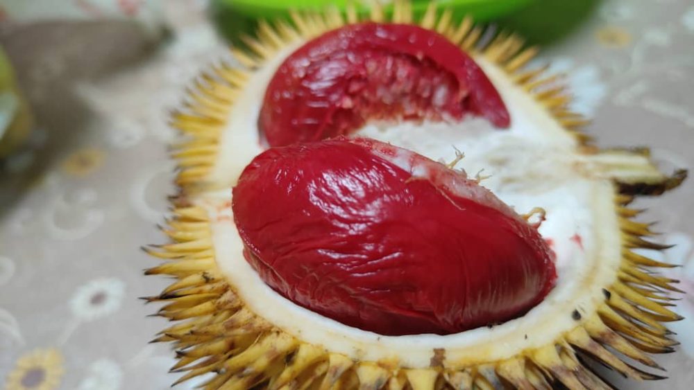 “Durian merah atau dikenali sebagai durian ‘utak udang’ ini yang ingin kita promosikan. Baru-baru ini, walaupun musim buah menyaksikan lambakan hasil, harga kedua-dua jenis ini tidak jatuh kerana mendapat permintaan dan sambutan tinggi daripada pasaran tempatan serta negara jiran, Brunei Darussalam,” katanya ketika ditemui media semasa lawatan kerja ke Taman Kekal Pengeluaran Makanan (TKPM) Kubong, petang tadi.