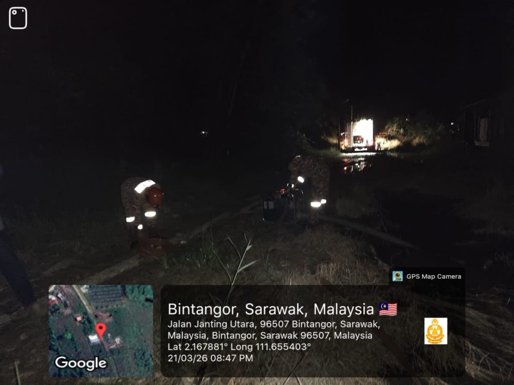 PIHAK bomba menjalankan pemantauan di kawasan berisiko di Batu 12, Jalan KJD pada semalam. Foto BBP Bintangor