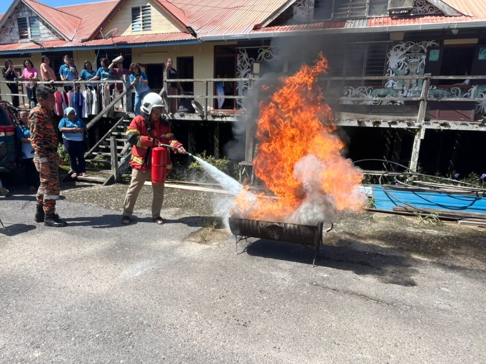 GAMBAR FAIL…Latihan menggunakan alat pemadam api menggunakan cara betul di Rumah Jana, Batu Matop. Foto BBP Bintangor