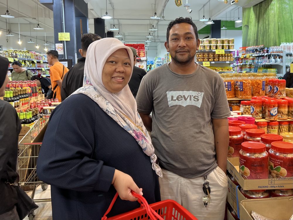 MISYADI (kanan), 38, dari Bau, mengatur belanjanya sambil memilih barangan keperluan asas, walaupun berdepan peningkatan kos. Foto Adele Rissa