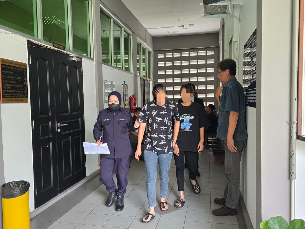 DIDAKWA….Dua suspek wanita diiringi keluar setelah dihadapkan di Mahkamah Majistret di Sibu, hari ini.