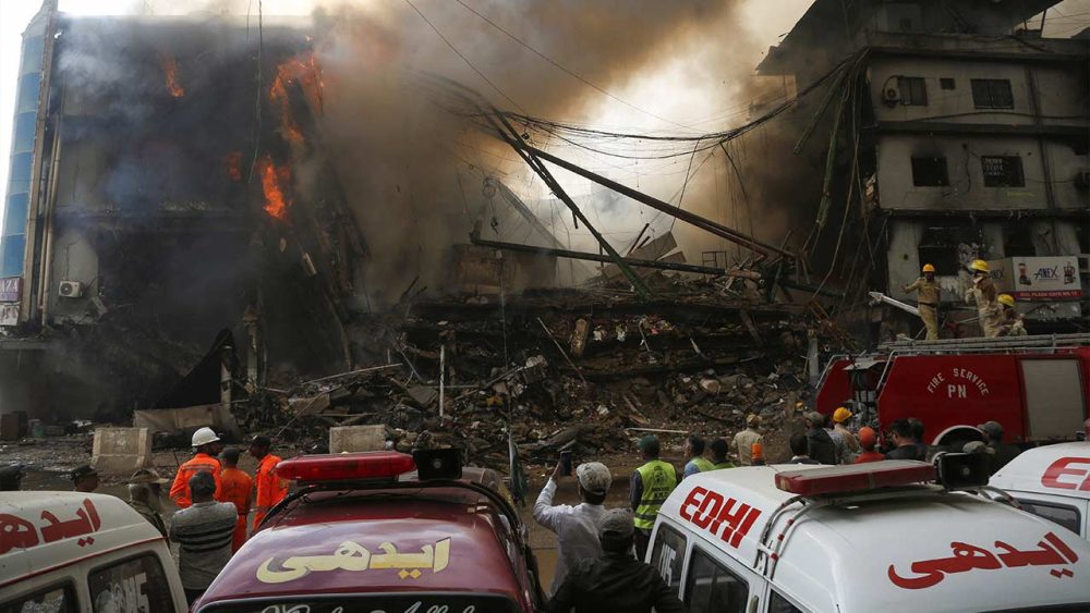 Kebakaran itu memusnahkan bangunan bertingkat Gul Plaza yang terletak di Jalan M.A. Jinnah.