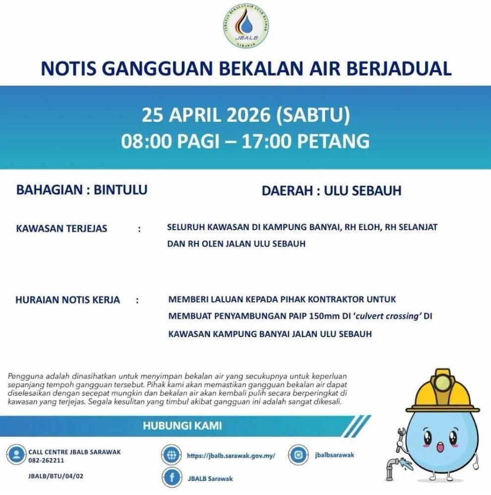BINTULU: Penduduk di beberapa kawasan di Ulu Sebauh akan mengalami gangguan bekalan air berjadual pada Sabtu ini, 25 April 2026, bermula 8.00 pagi hingga 5.00 petang.