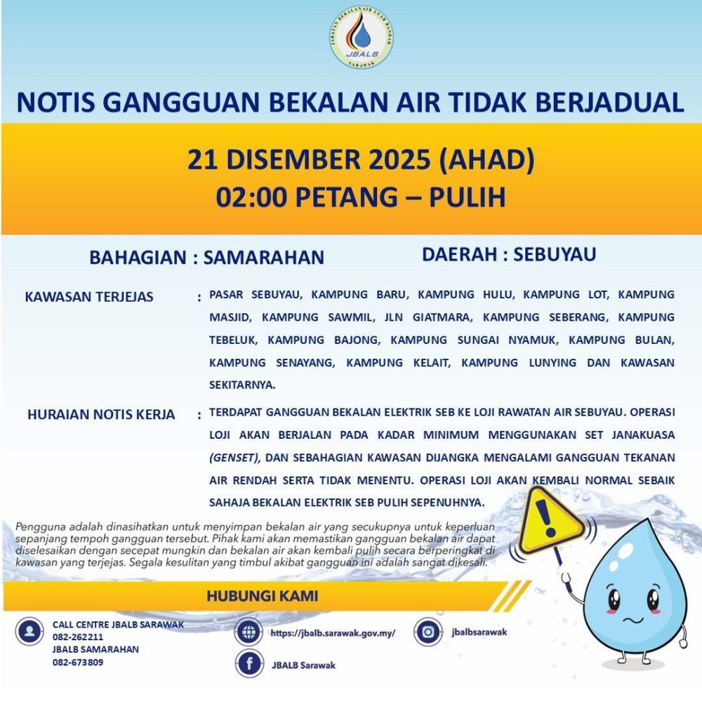 GANGGUAN bekalan air tidak berjadual melibatkan beberapa kawasan di Sebuyau bermula 2.00 petang tadi, susulan gangguan bekalan elektrik ke Loji Rawatan Air Sebuyau. Pengguna dinasihatkan menyimpan bekalan air secukupnya. Foto JBALB