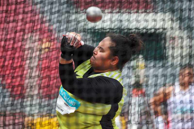 JAGUH baling tukul besi wanita negara Grace Wong Xiu Mei raih emas, cipta rekod temasya dengan catatan 65.41 meter (m) sempena Sukan SEA di Suphachalasai Stadium, National Stadium, Bangkok hari ini. Foto BERNAMA