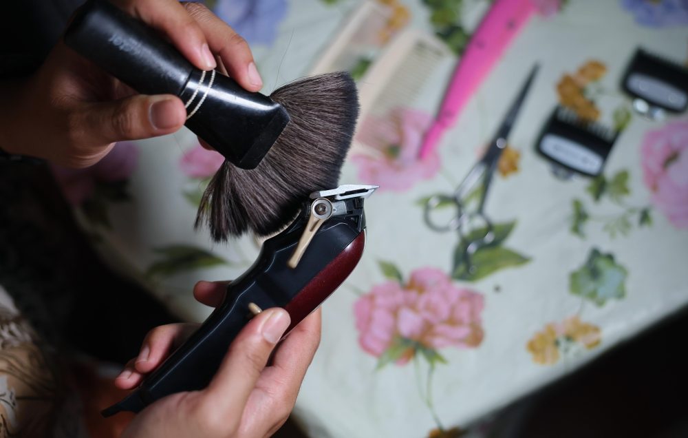 EZUAN Husaini, 33, tekun membersihkan serta menyusun peralatan menggunting rambutnya selepas selesai sesi dandanan. Foto AFP