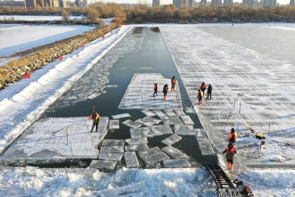 PEKERJA menuai ais dari Sungai Songhua yang membeku sebagai persiapan bagi Festival Dunia Ais dan Salji Harbin tahunan di Harbin, wilayah Heilongjiang di timur laut China pada 8 Disember 2025. Foto AFP