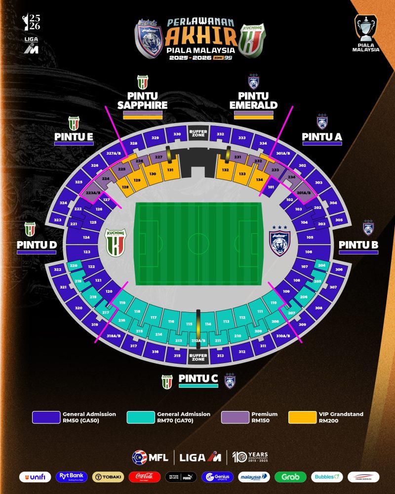 KUALA LUMPUR: Liga Bola Sepak Malaysia (MFL) hari ini mengumumkan harga tiket perlawanan akhir Piala Malaysia 2025-2026 antara Johor Darul Ta’zim (JDT) dan Kuching City FC di TM Stadium Nasional pada 23 Mei ini, kekal seperti musim lepas.