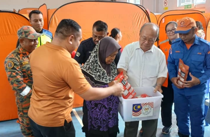 AMBIL BERAT…Henry Sum turut memeriksa bekalan sumbangan untuk mangsa banjir daripada NADMA di Pusat Pemindahan Sementara Dewan Trusan baru-baru ini.