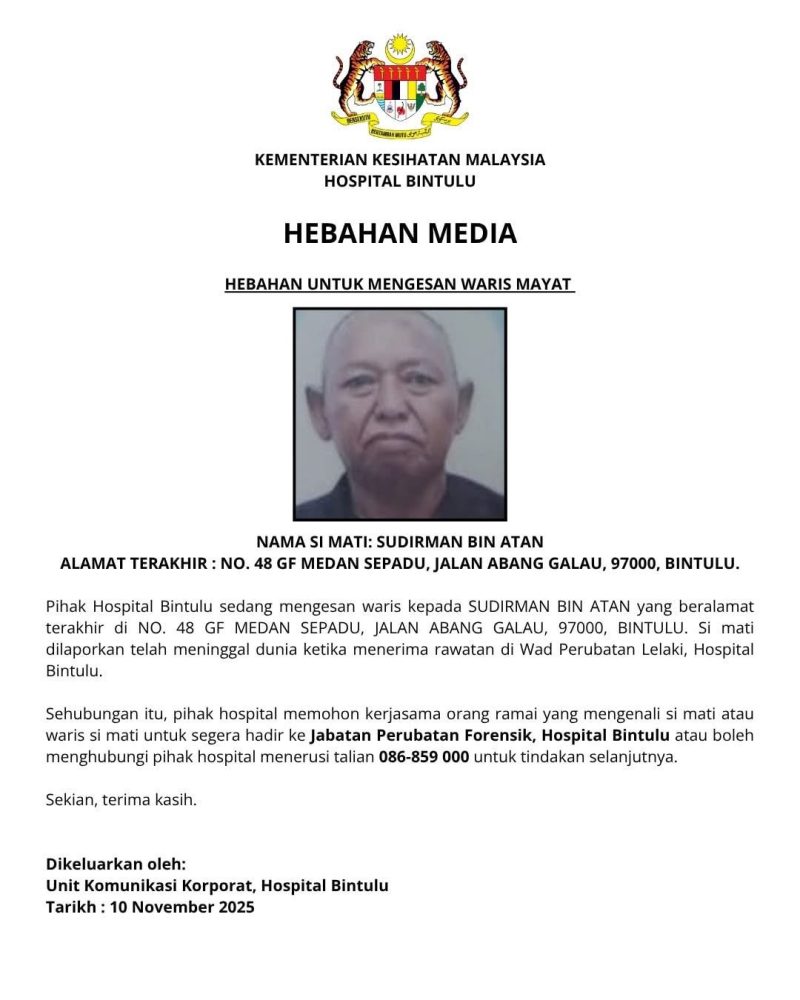 PIHAK Hospital Bintulu memohon bantuan orang ramai mengesan waris kepada Sudirman Atan yang meninggal dunia ketika menerima rawatan di hospital berkenaan.