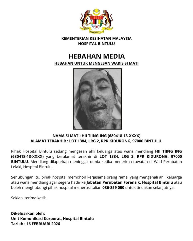 PIHAK Hospital Bintulu memohon bantuan orang ramai bagi mengesan waris kepada mendiang Hii Tiing Ing yang meninggal dunia ketika menerima rawatan di hospital berkenaan.