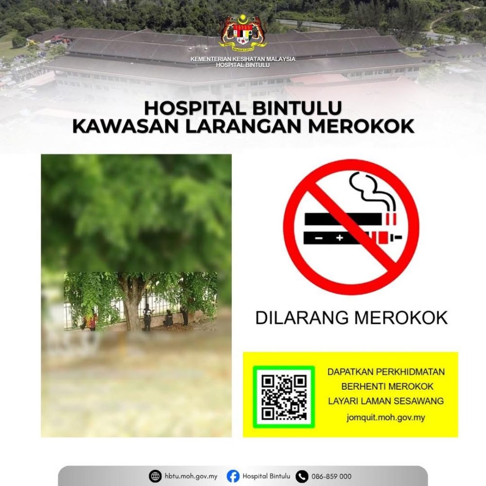 Menurut kenyataan hospital itu, larangan berkenaan dikuatkuasakan di bawah Akta Kawalan Produk Merokok Demi Kesihatan Awam 2024 dengan operasi pemantauan dijalankan oleh Pejabat Kesihatan Bahagian (PKB) Bintulu di kawasan yang telah diwartakan termasuk seluruh persekitaran hospital.