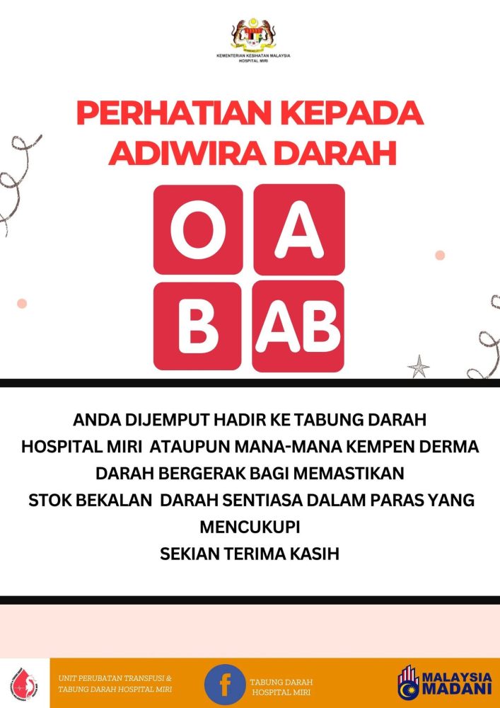 MIRI: Tabung Darah Hospital Miri menggesa orang ramai yang mempunyai kumpulan darah A, B, O dan AB untuk tampil menderma darah sama ada di unit Tabung Darah Hospital Miri atau di mana-mana kempen derma darah bergerak yang dianjurkan dari semasa ke semasa.
