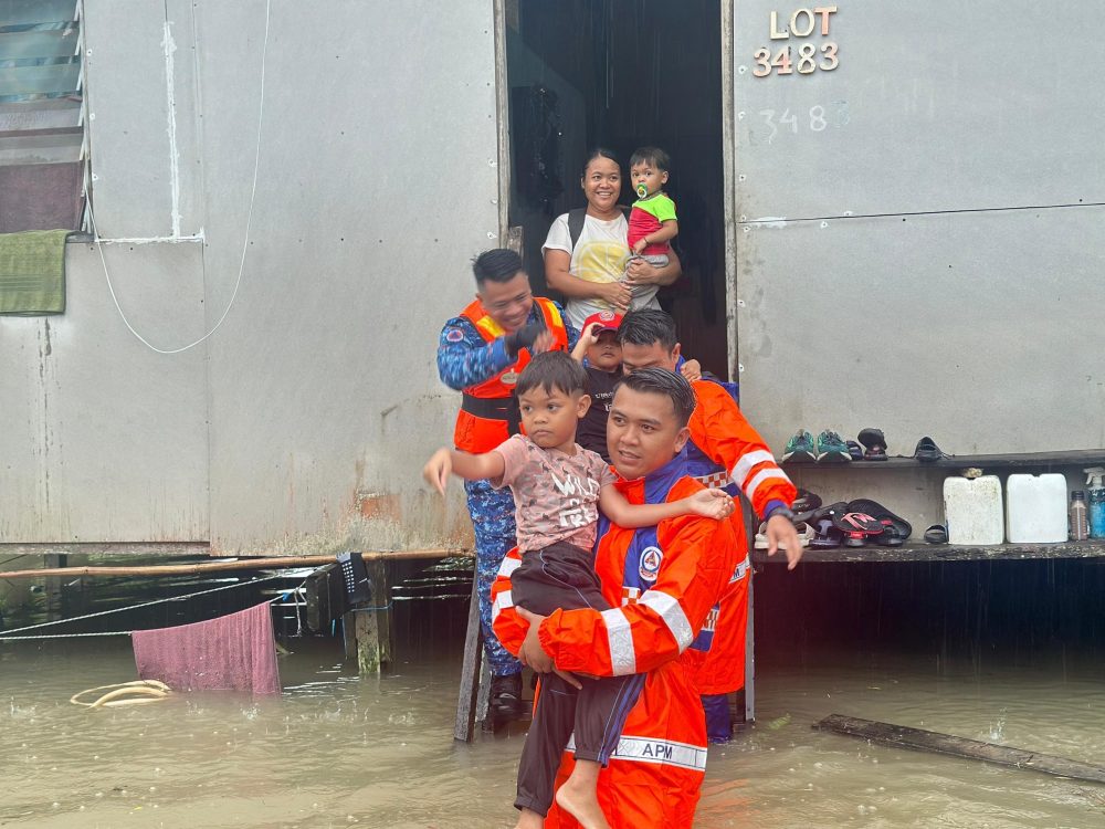 PENDUDUK Kampung Sinar Budi Baru dipindahkan ke PPS Dewan R-Piang susulan banjir yang melanda kawasan itu hari ini. Foto JBPM Sarawak