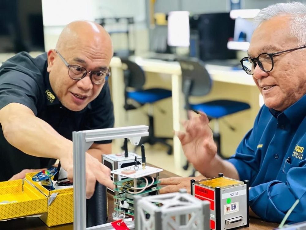 SHUHAIMI Mansor  (kiri) bersama Datuk Kadim Suadi (kanan) meneliti modul satelit bersaiz kecil (CubeSat) dalam sesi perbincangan berkaitan pembangunan keupayaan aeroangkasa dan teknologi angkasa di Kolej Universiti i-CATS. Foto i-CATS