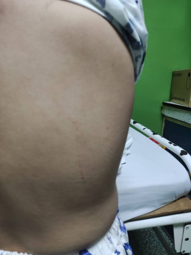 Pemeriksaan doktor mengesahkan mangsa mengalami kecederaan tisu lembut di bahagian belakang badan dan muka.