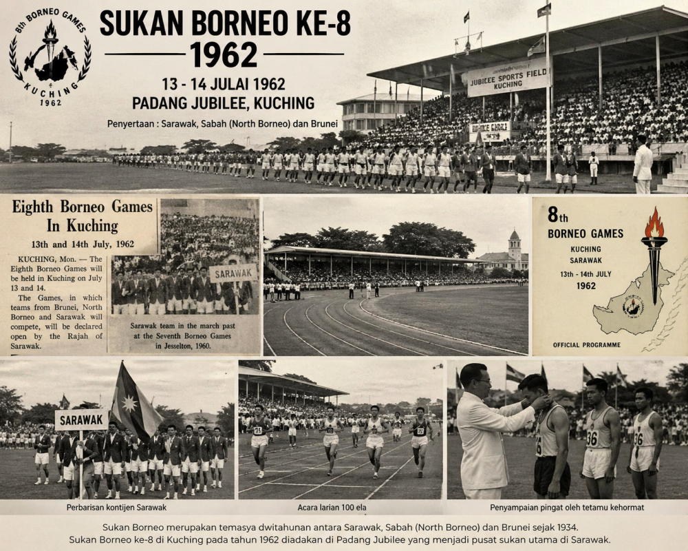 Penganjuran sukan ini pada 1962 adalah penganjuran kedua bagi Sarawak. Sukan Borneo kelapan di Sarawak ini telah diadakan di Padang Jubilee. Sukan ini berlangsung selama dua hari dari 13 hingga 14 Julai 1962.