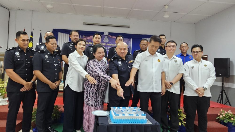 KPD Meradong, DSP Tansli Mering bersama Wong Zee Yeng (tiga kiri) dan ADUN Meradong, Datuk Ding Koung Hiing memmotong kek sempena sambutan peringatan Hari Polis Ke-219 Peringkat IPD Meradong, bertempat di Dewan Pejabat Daerah Lama, hari in