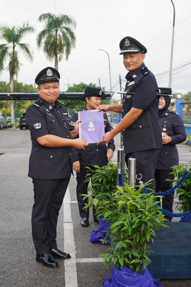 KETUA Polis Daerah Mukah, Deputi Superintendan Muhamad Rizal Alias menyampaikan sijil penghargaan kepada salah seorang anggota Perhimpunan Bulanan IPD Mukah bagi bulan Januari. Foto IPD Mukah