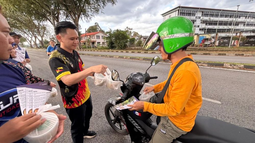 SIBU: Skuad Antidadah Daerah Sibu dengan kerjasama Agensi Antidadah Kebangsaan (AADK) Sibu mengagihkan sebanyak 400 bekas bubur lambuk kepada orang ramai di Taman Harmoni hari ini.