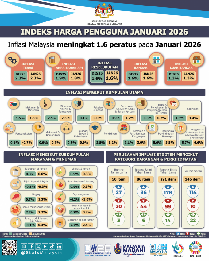INFLASI Malaysia meningkat 1.6 peratus pada Januari 2026 dengan mata indeks meningkat kepada 135.7 daripada 133.6 pada bulan yang sama tahun lepas. Foto Jabatan Perangkaan Malaysia