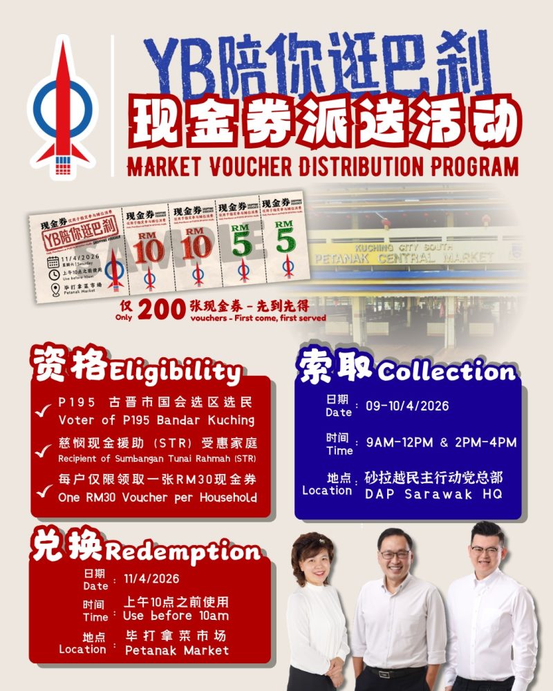 Beliau menambah, orang ramai boleh menuntut baucar pada esok dan 10 April ini di Ibu Pejabat DAP Kuching dari 9.00 pagi hingga 12.00 tengah hari dan 2.00 petang hingga 4.00 petang. Permohonan lewat tidak akan dilayan, katanya.