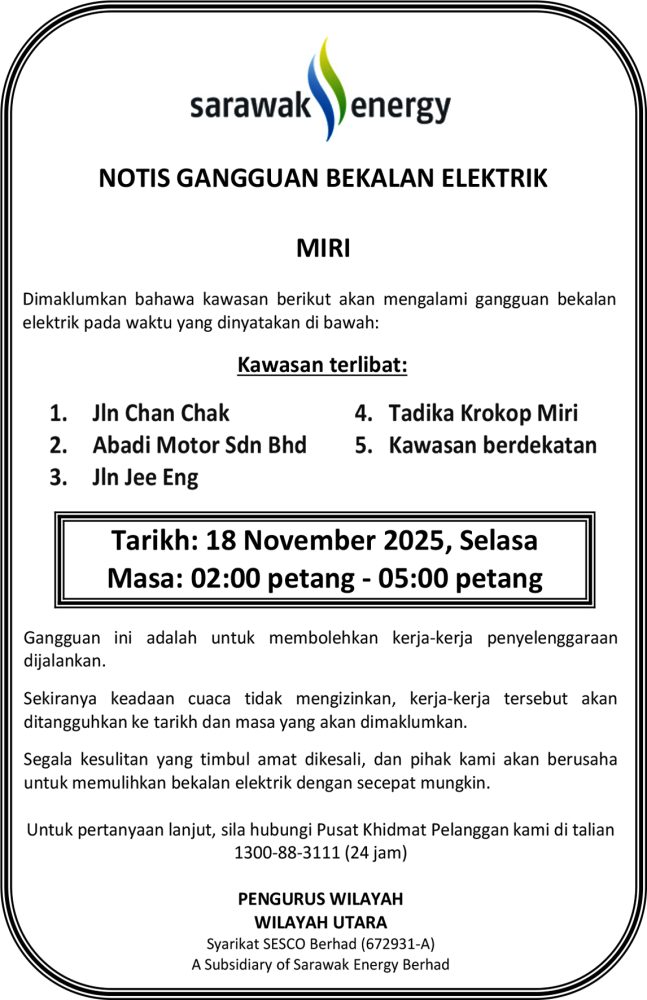 IKLAN Isnin, 17-18 November 2025, SEB Notis Gangguan Bekalan Elektrik Miri (Krokop) Utusan Sarawak 6 hours ago Continue Reading Previous: Isnin, 17-18 November 2025, SEB Notis Gangguan Bekalan Elektrik Miri