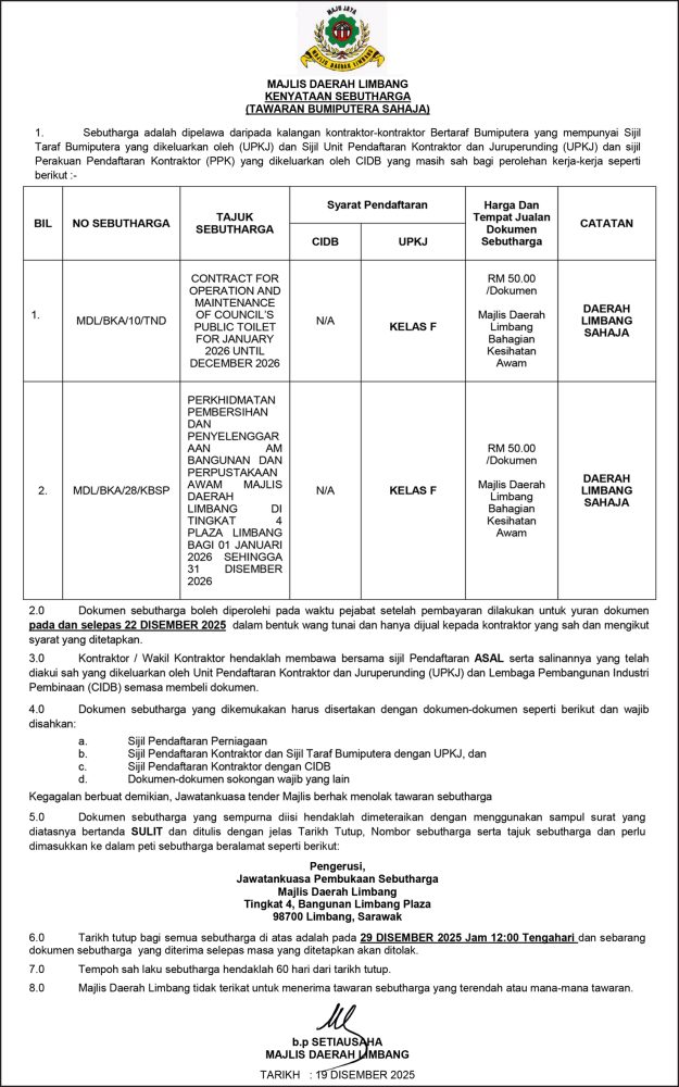 IKLAN Isnin, 22 Disember 2025, Majlis Daerah Limbang Kenyataan Sebutharga (Tawaran Bumiputera Sahaja) Utusan Sarawak 7 hours ago