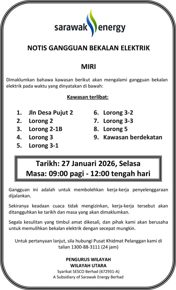 IKLAN Isnin, 26-27 Januari 2026, SEB Notis Gangguan Bekalan Elektrik Miri (Jalan Desa Pujut 3) Utusan Sarawak 10 hours ago Continue Reading Previous: Ahad, 25-26 Januari 2026, SEB Notis Gangguan Bekalan Elektrik Miri (Jln Tudan)Next: Isnin, 26-27 Januari 2026, SEB Notis Gangguan Bekalan Elektrik Miri (Lambir)