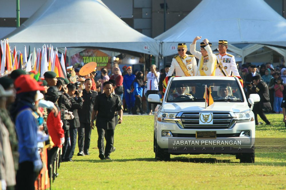 LINTAS HORMAT… Tun Wan Junaidi melakukan lintas hormat menggunakan kenderaan khas, diiringi Premier Sarawak, Datuk Patinggi Tan Sri Abang Johari Tun Openg.